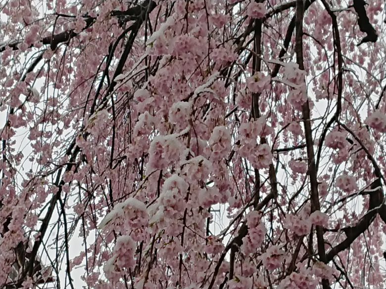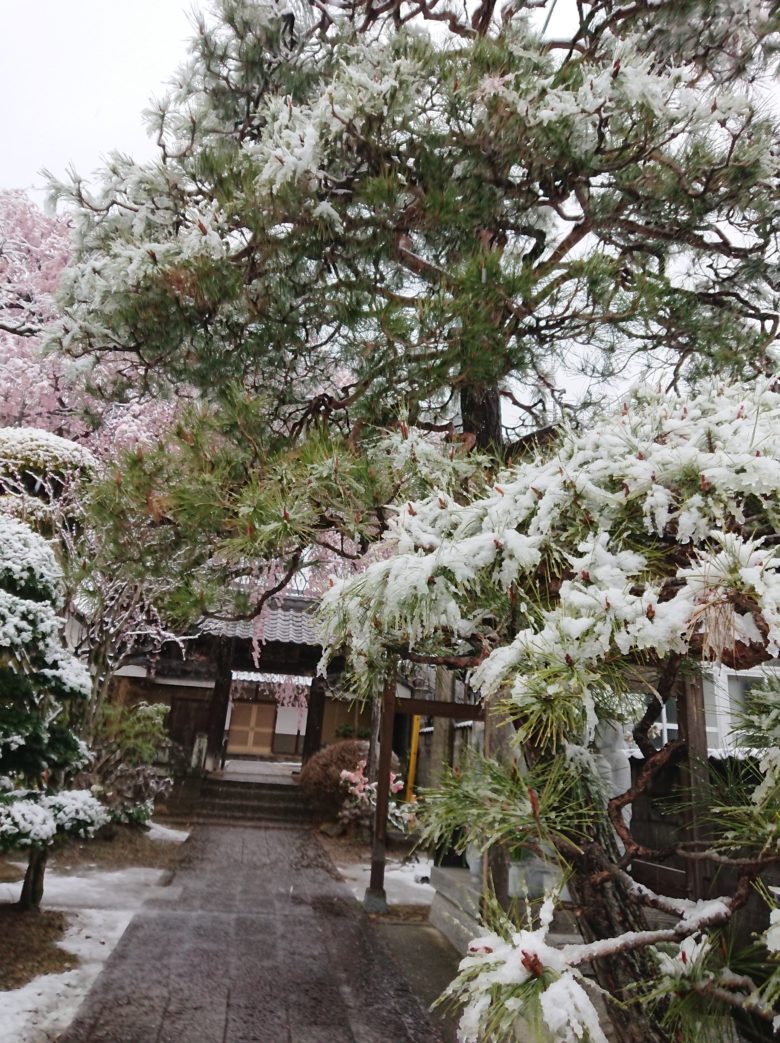 余談ですが、この地域は寒いので、まれにですが、雪の積もった桜という珍しい光景を見ることができます。もともと雪の少ない地域でもありますので、レアな光景だと思います。黄梅院の桜も見事な雪化粧で美しい!