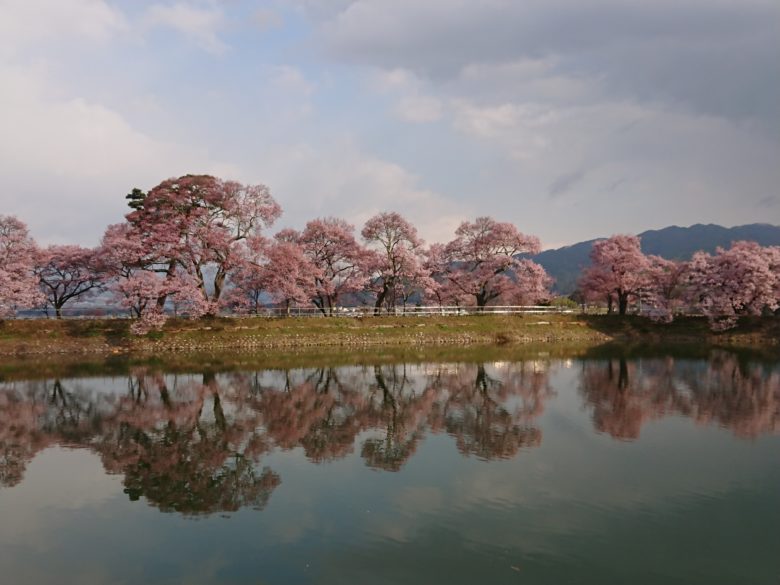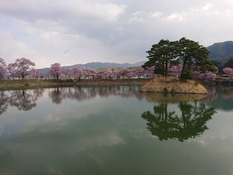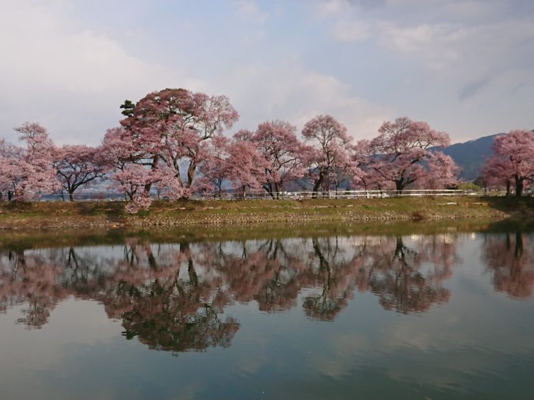 ここをおすすめする理由は、なんといっても、水面に映る美しい桜とアルプス。桜だけでも綺麗ですが、雄大なアルプスも映えます。